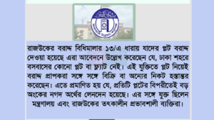 রাজউকের বরাদ্দ বিধিমালার ১৩/এ ধারায় যাদের প্লট বরাদ্দ দেওয়া হয়েছে এরা আবেদনে উল্লেখ করেছেন যে, ঢাকা শহরে বসবাসের কোনো প্লট বা ফ্ল্যাট নেই। যদিও শুধুমাত্র এই যুক্তিতে প্লট বরাদ্দের কোনো সুযোগ নেই তারপরও নিয়মনীতি লঙ্ঘন করে গণহারে প্লট বরাদ্দ দেয়া হয়েছে বিগত আওয়ামী লীগ সরকারের আমলে। বসবাসের কোনো প্লট/ফ্ল্যাট নেই- এই যুক্তিতে প্লট বরাদ্দ নিয়েই প্লট প্রাপকরা সঙ্গে সঙ্গে বিক্রি বা অন্যের নিকট হস্তান্তর করেছেন। এতে প্রমাণিত হয় যে, প্রতিটি প্লটের বিপরীতেই বড় অংকের নগদ অর্থের লেনদেন হয়েছে। এর সঙ্গে যুক্ত ছিলেন মন্ত্রণালয় এবং রাজউকের তৎকালীন প্রভাবশালী ব্যক্তিরা। এ ব্যাপারে তদন্ত কমিটির প্রতিবেদনে বলা হয়েছে, “প্লট বরাদ্দের পর পরই তারা আর্থিকভাবে লাভবান হওয়ার জন্য প্লটের মালিকানা হস্তান্তর করেছেন। এ অবৈধ এবং অনৈতিক প্রক্রিয়ার সাথে তৎকালীন সরকারের উচ্চ পর্যায় থেকে শুরু করে রাজউকের সংশ্লিষ্টতা লক্ষণীয়।” হাইকোর্টের নির্দেশে সাবেক গ্রেড-১ ভুক্ত কর্মকর্তা মহ: মনিরুজ্জামান- এর নেতৃত্বে গত ২৯ মে এই তদন্ত কমিটি গঠিত হয়। কমিটি ইতিমধ্যে ৩০০টি প্লটের অনিয়ম উদঘাটন করে এ সংক্রান্ত প্রতিবেদন মন্ত্রণালয় এবং হাইকোর্টে দাখিল করেছে।
